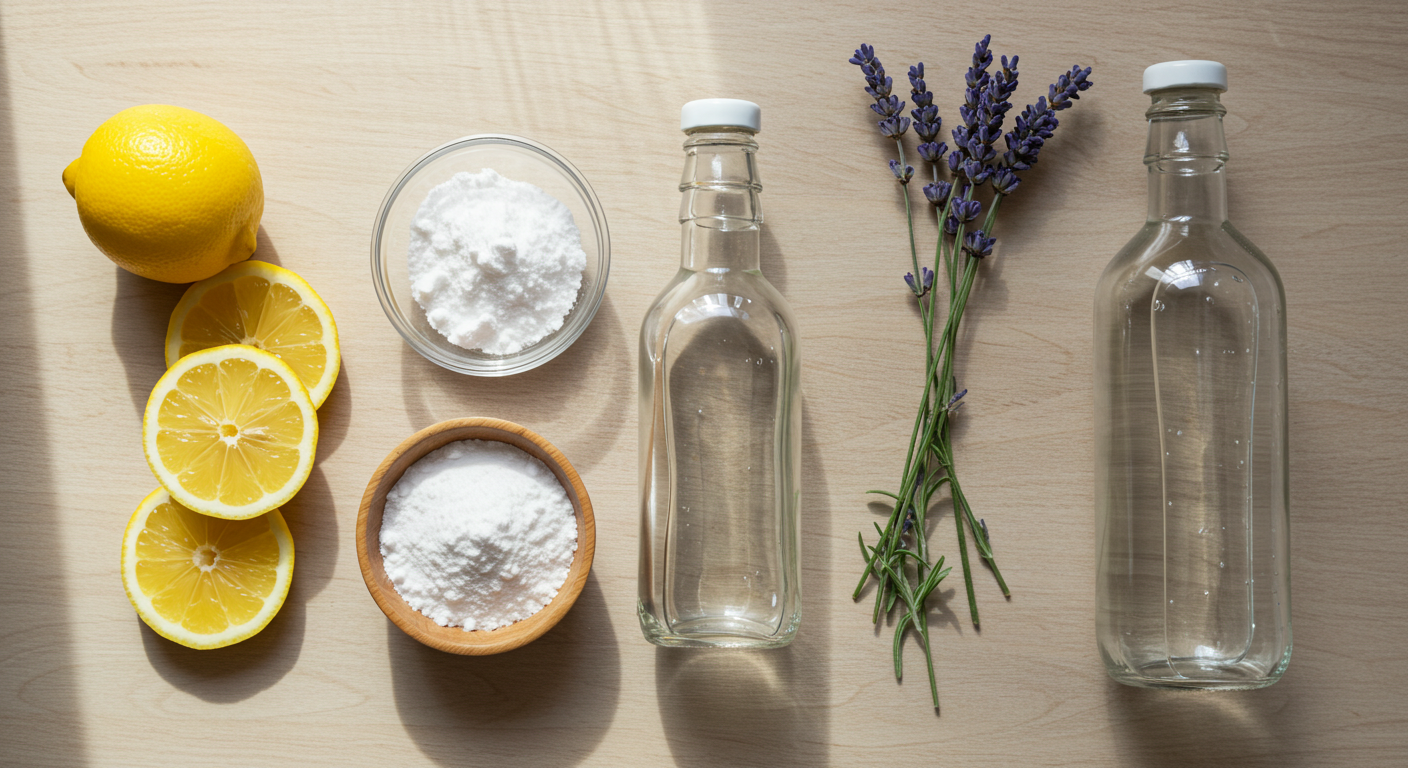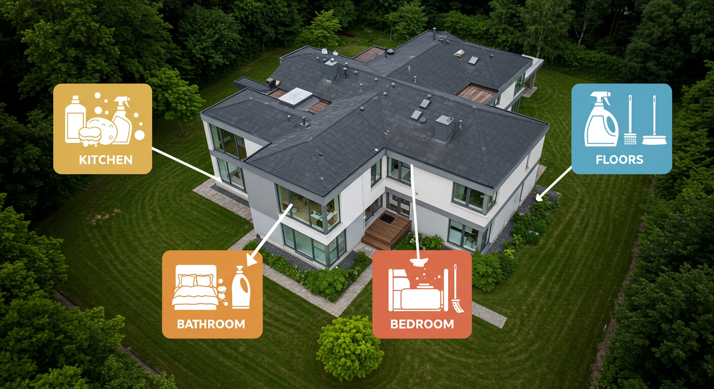 Kitchen: mild degreasers. Bathroom: chlorine-free disinfectants. Bedrooms and living rooms: neutral and preferably aromatic products. Floors: specific to the type of material. And most importantly: